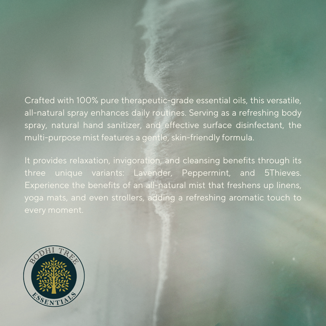 Made 100% pure therapeutic grade essential oils, our multi purpose mist is formulated to also meet the World Health Organization's recommendation for handrub. By utilizing ethanol instead of the frequently used isopropyl alcohol, the mist becomes more skin-friendly and leaves a pleasant scent.
